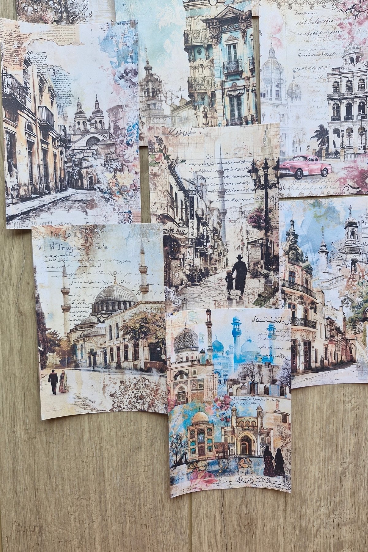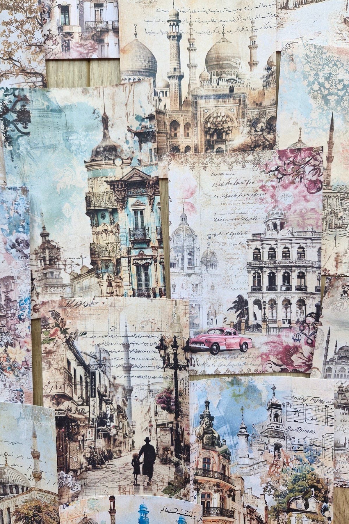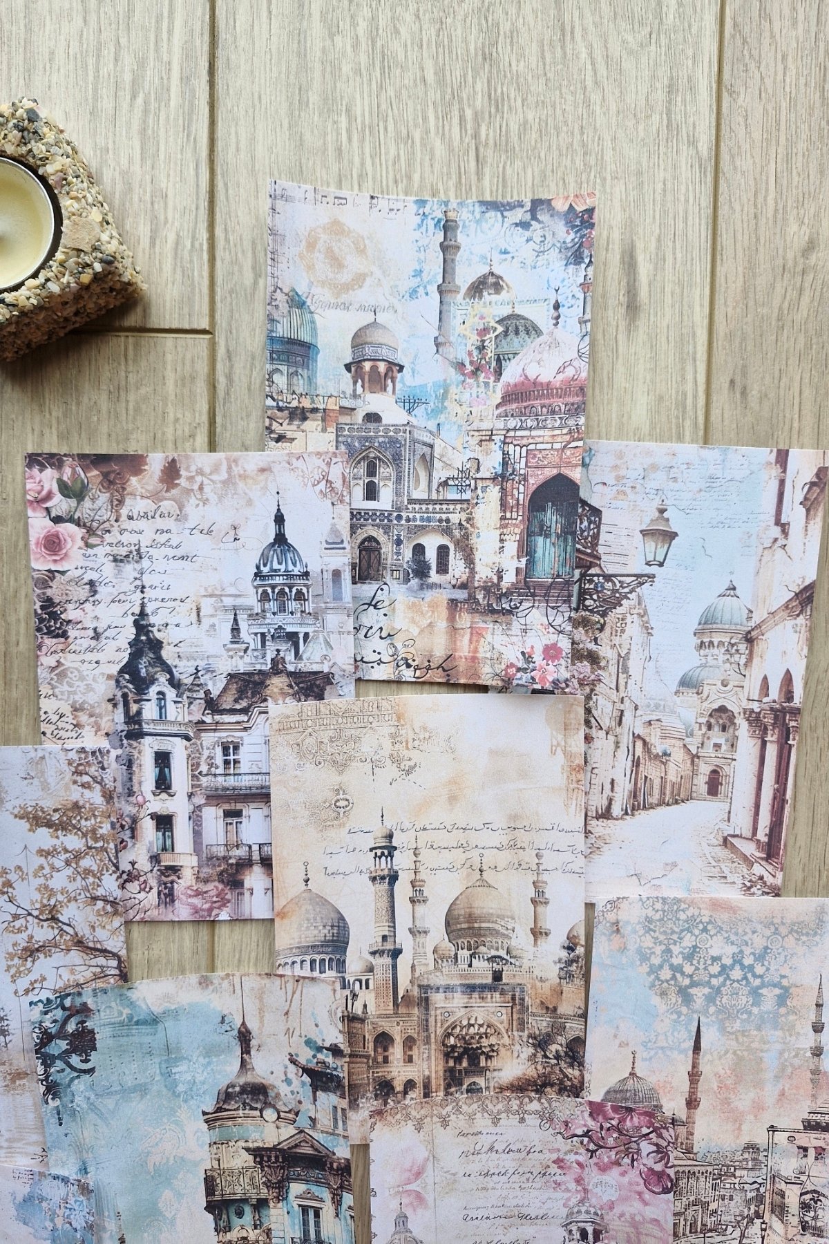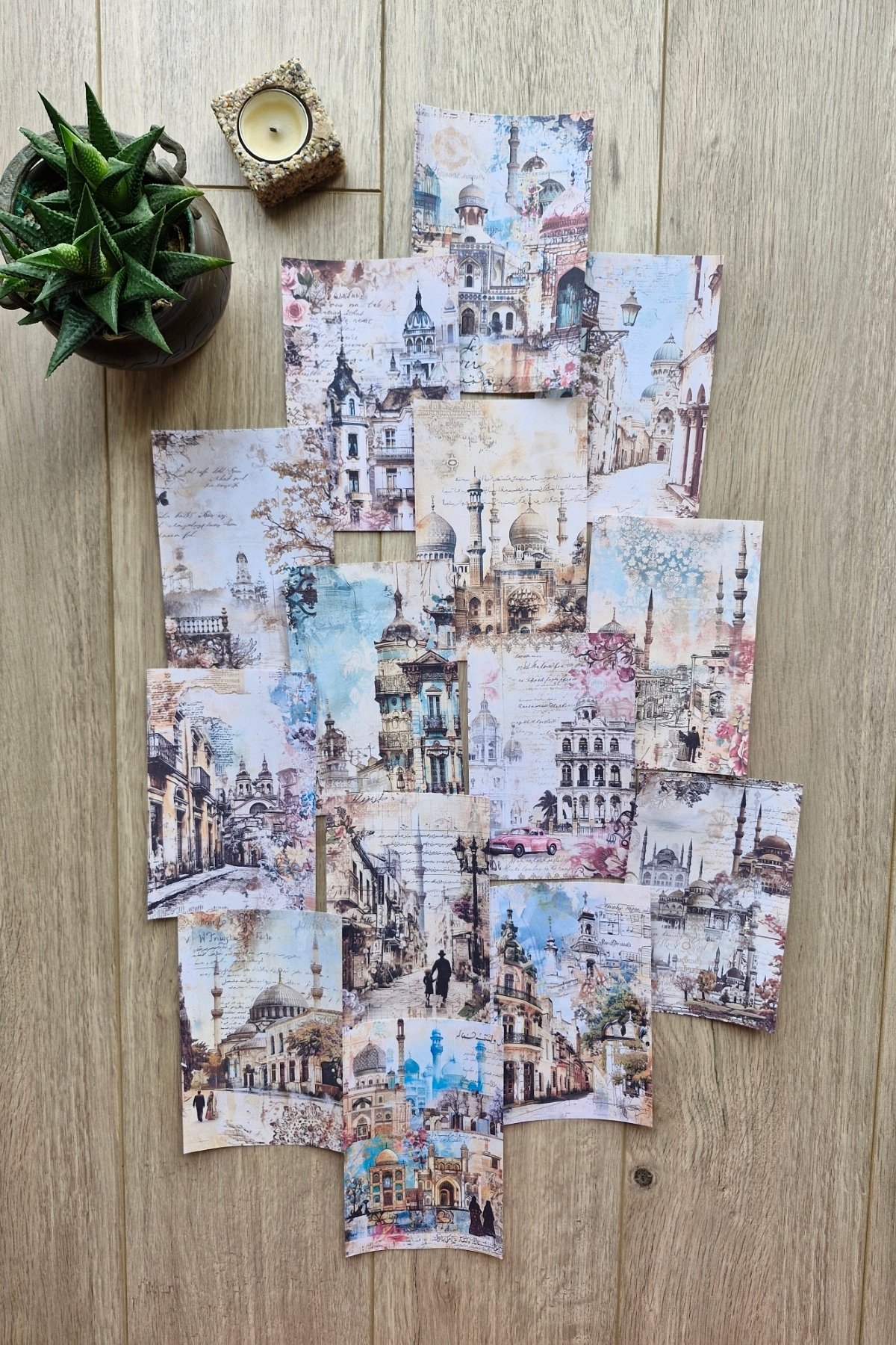 14 Adet Eskitme Camii Manzara Temalı Scrapbook Kağıt Seti Bullet Journal Dekupaj Kağıdı