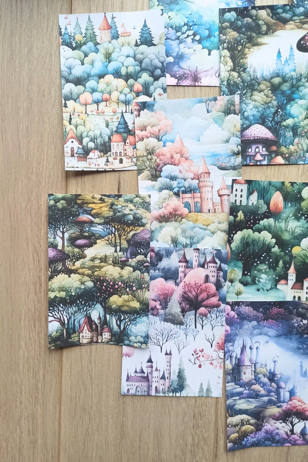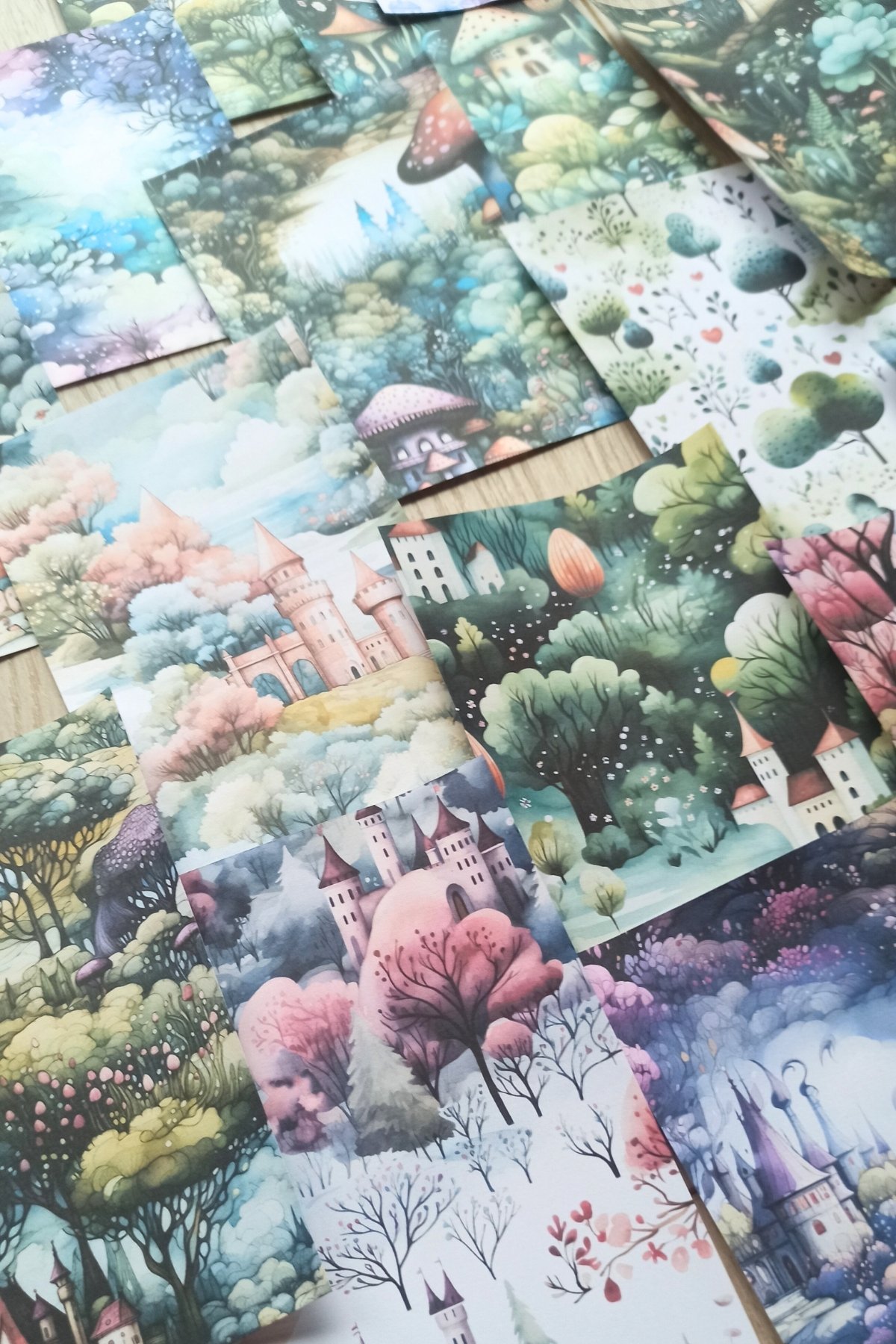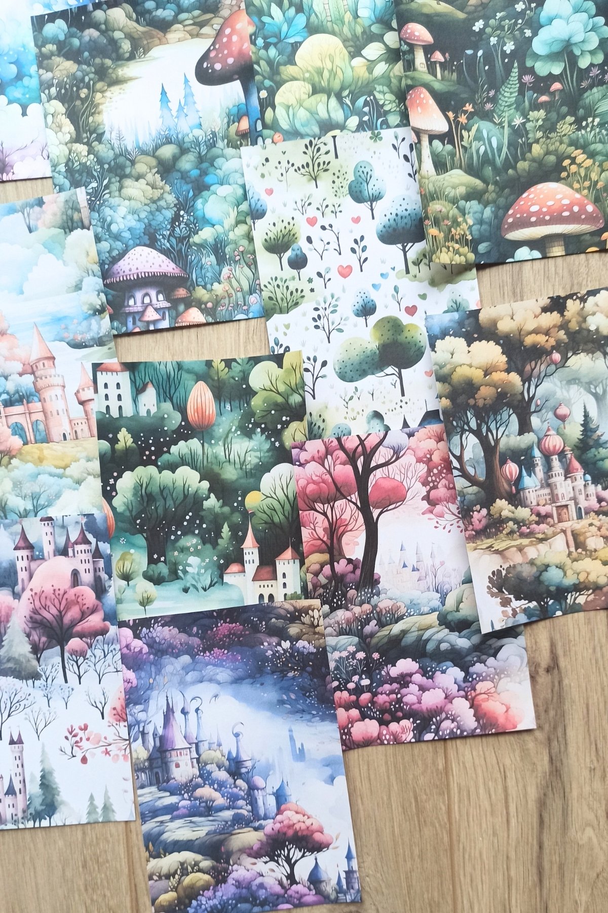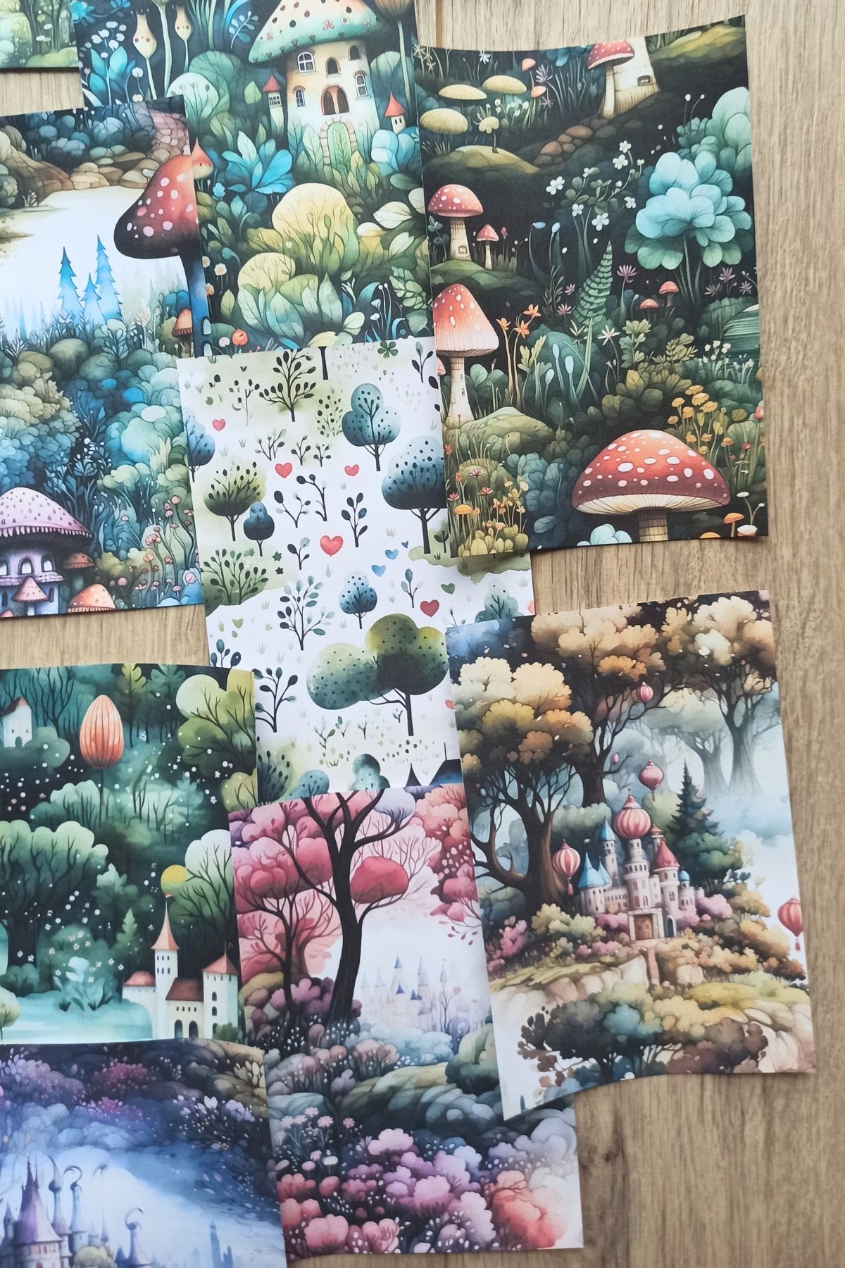 Renkli fotokopi kağıdı kullanılarak üretilmiş, büyülü orman temalı scrapbook kağıtları, yaratıcılığınızı serbest bırakmanız için ideal bir zemin sunar