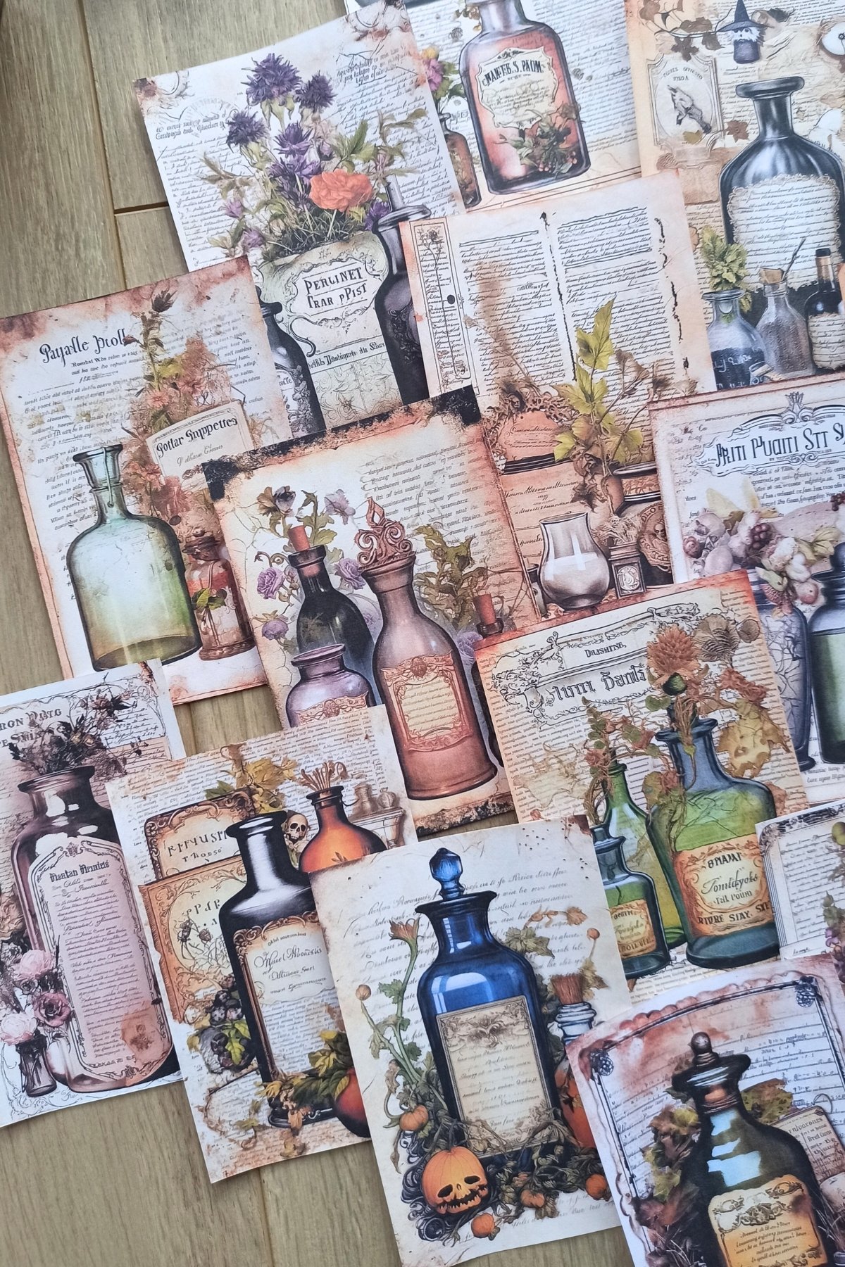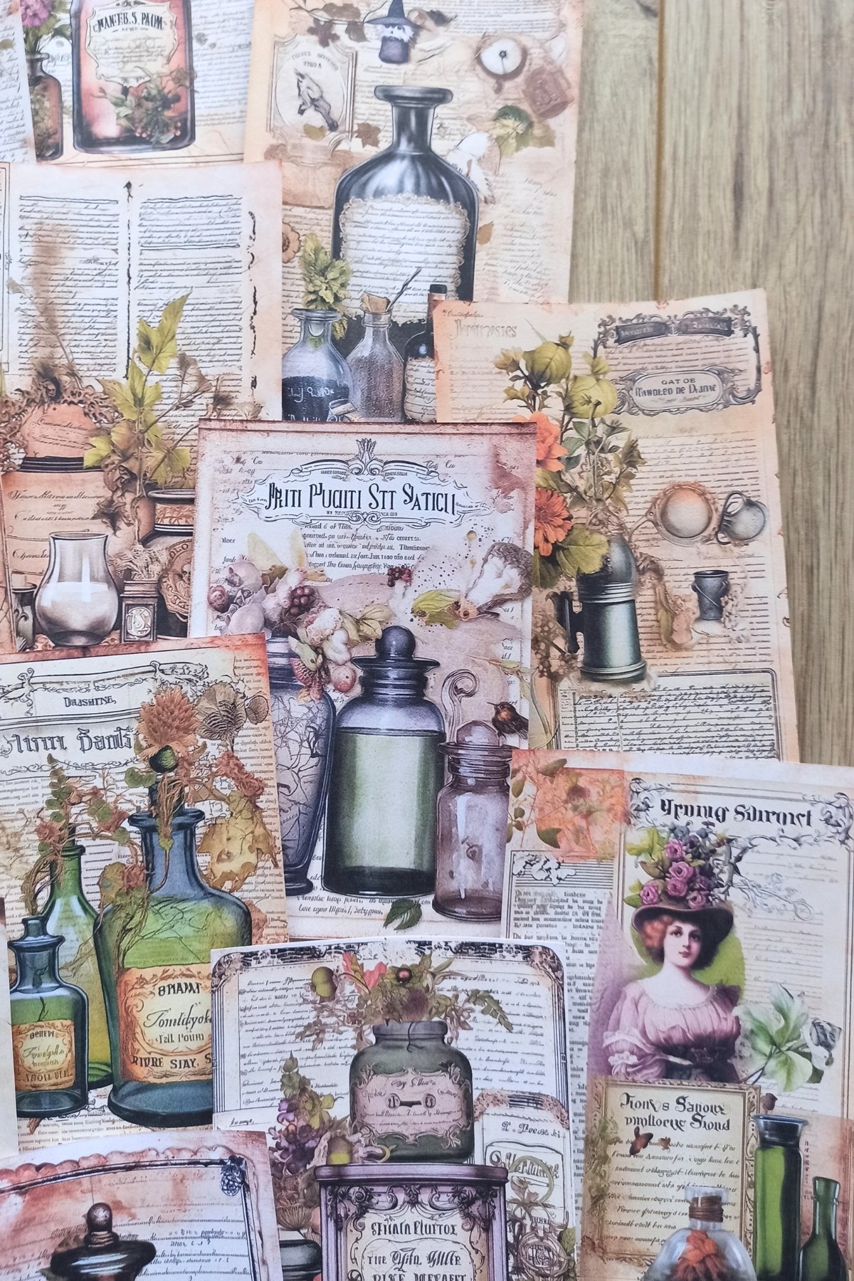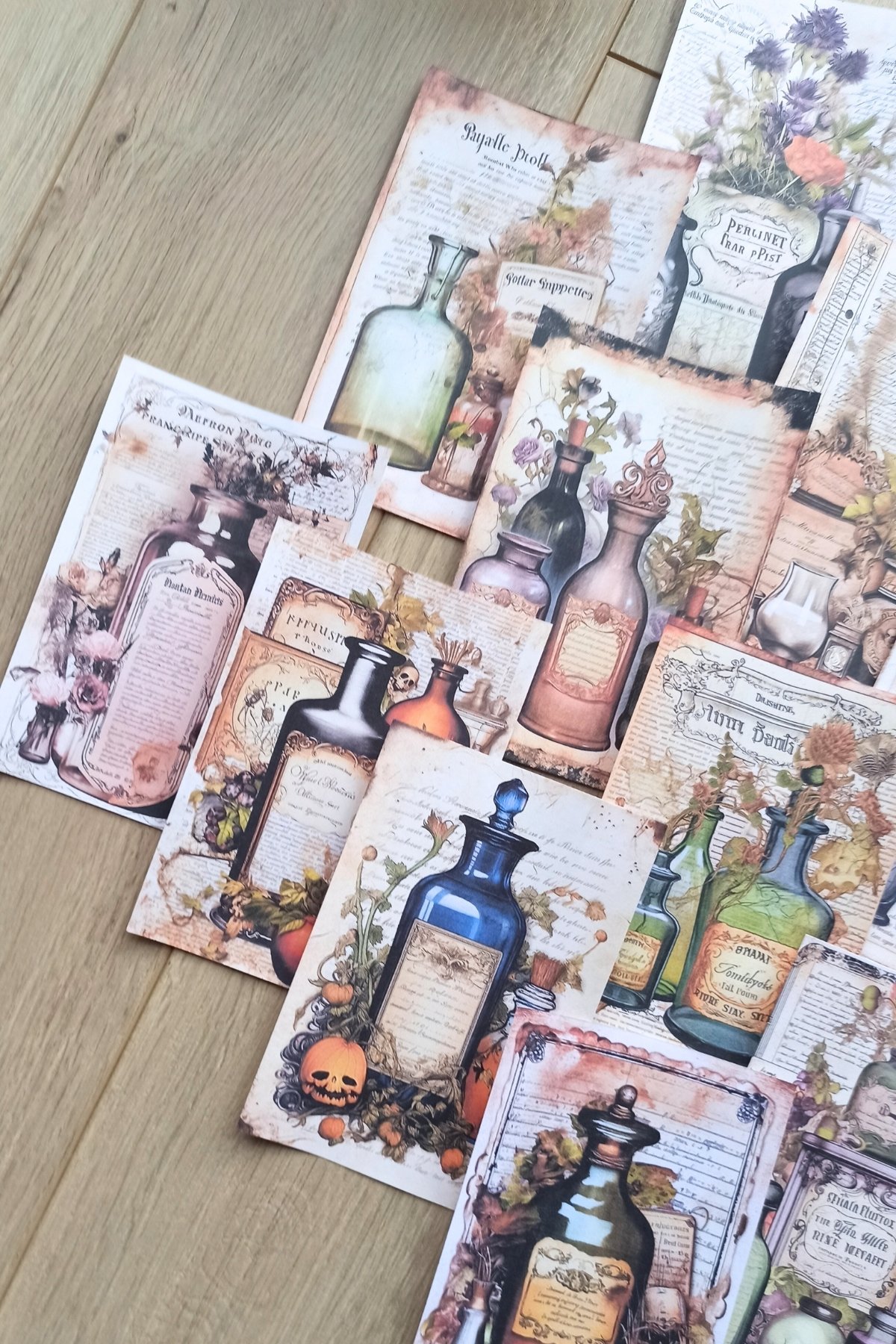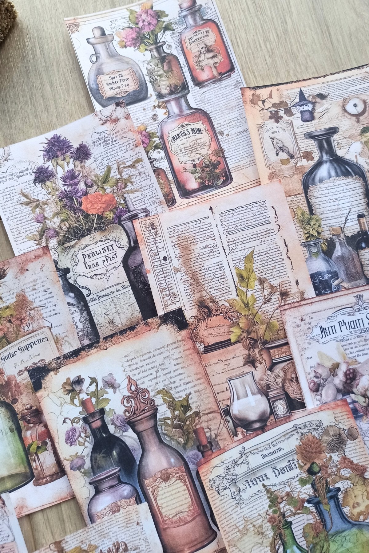 Eskitme vintage iksir şişesi temalı scrapbook kağıt seti, yaratıcılığınızı ifade etmeniz için ideal bir araçtır