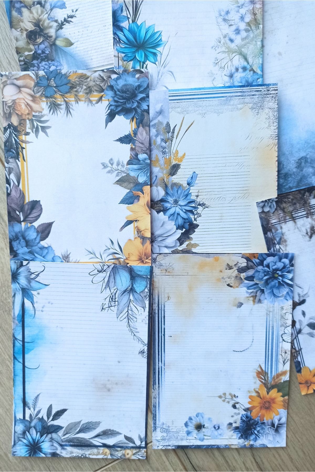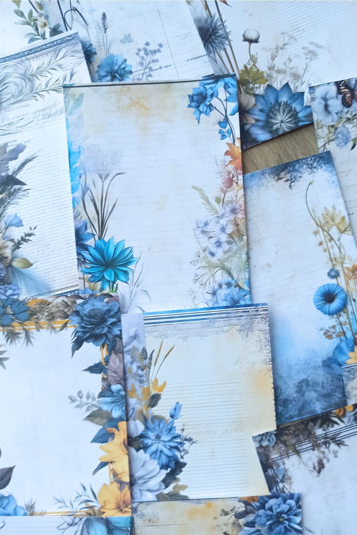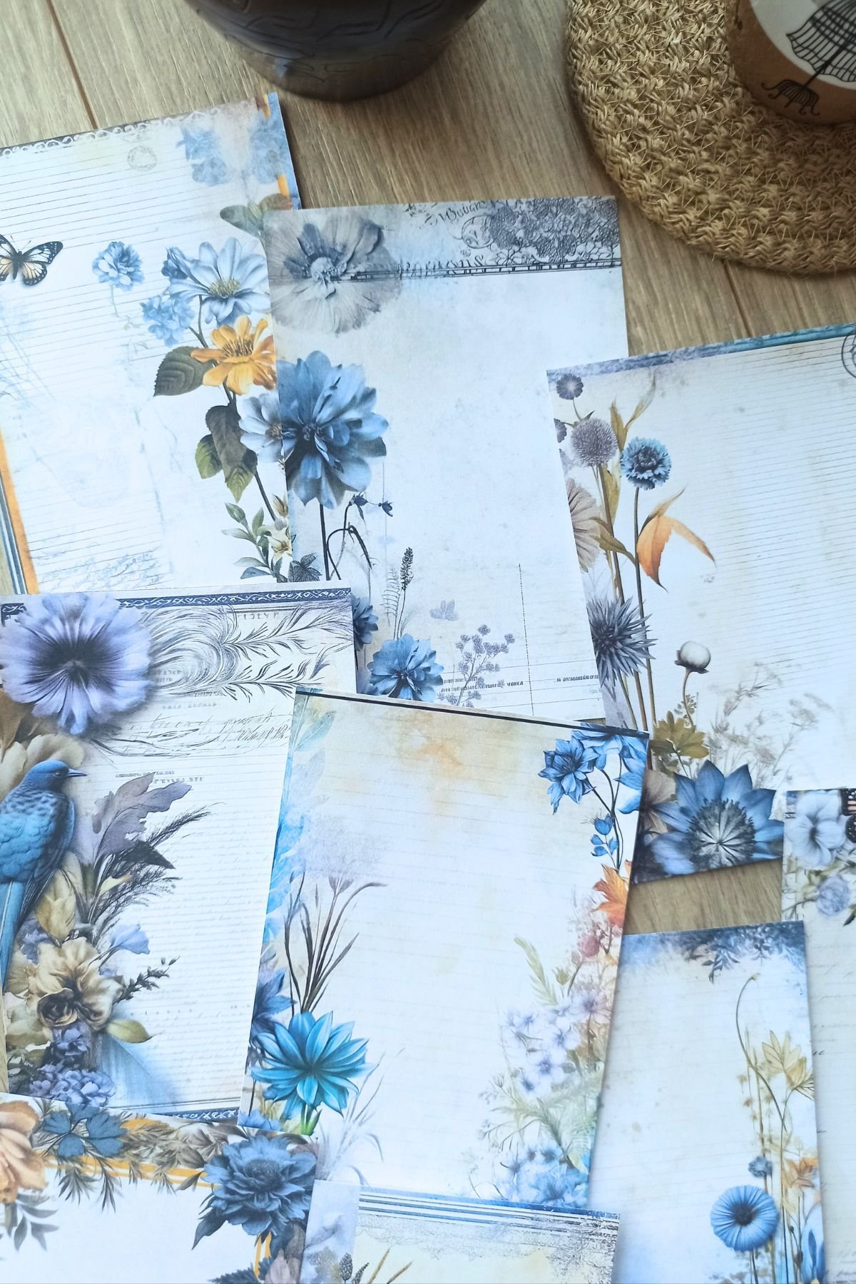 Vintage mavi çiçek temalı scrapbook kağıdı seti, yaratıcı projelerinizde kullanabileceğiniz renkli fotokopi kağıtlarından oluşur