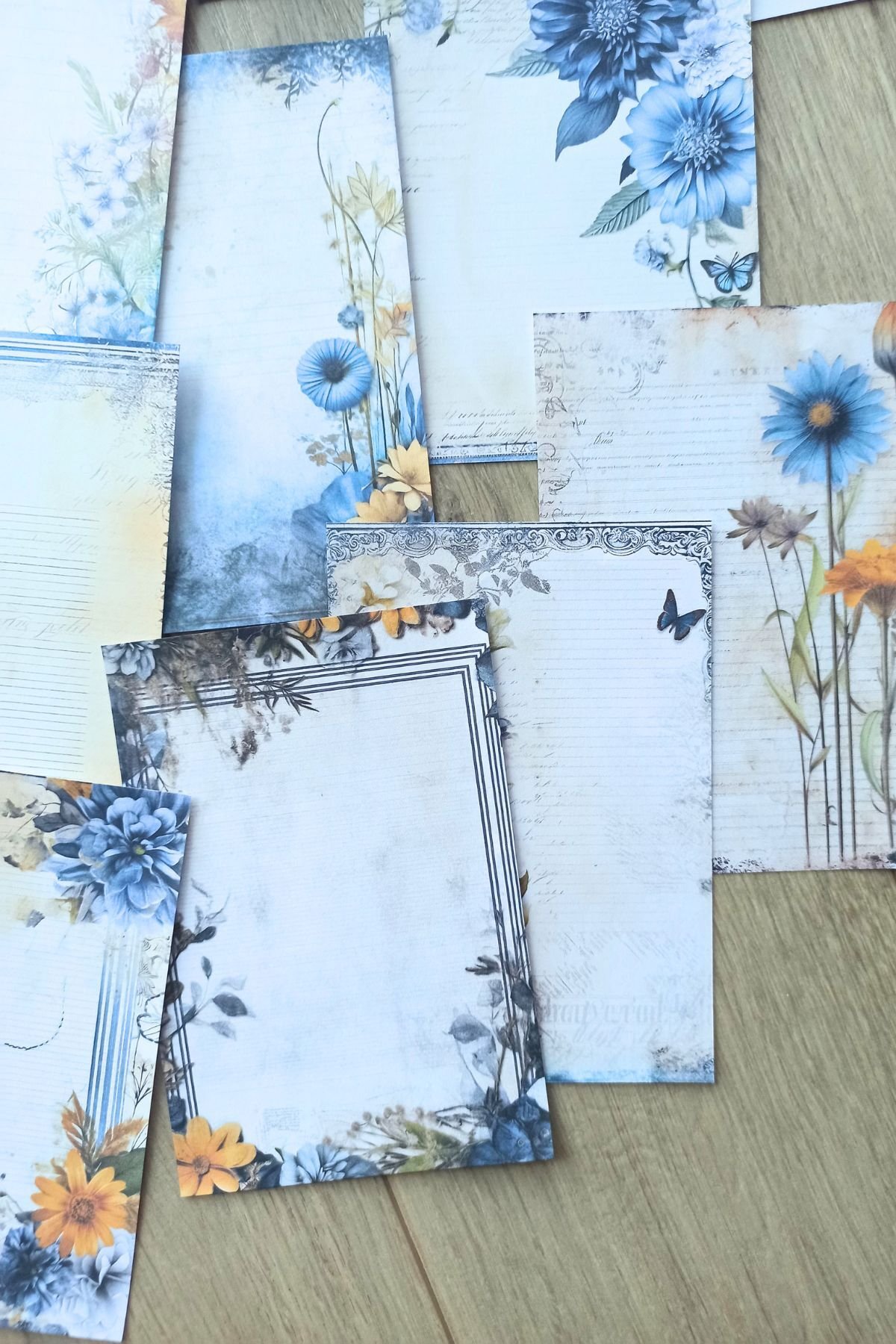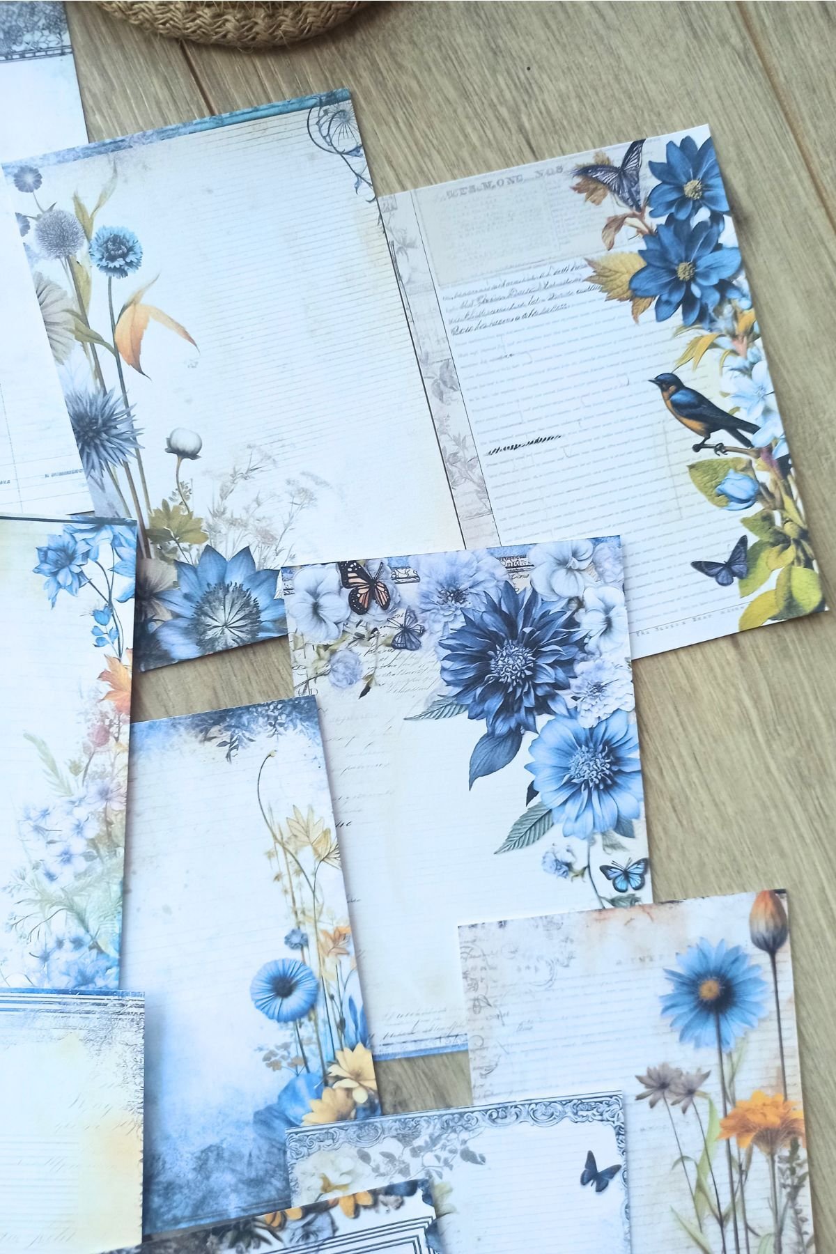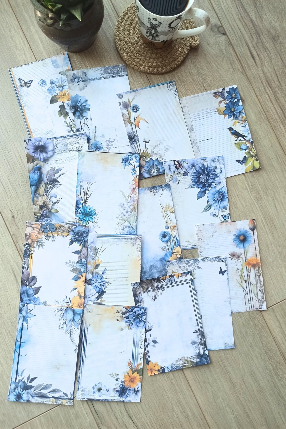 Vintage mavi çiçek temalı scrapbook kağıdı seti, yaratıcı projelerinizde kullanabileceğiniz renkli fotokopi kağıtlarından oluşur