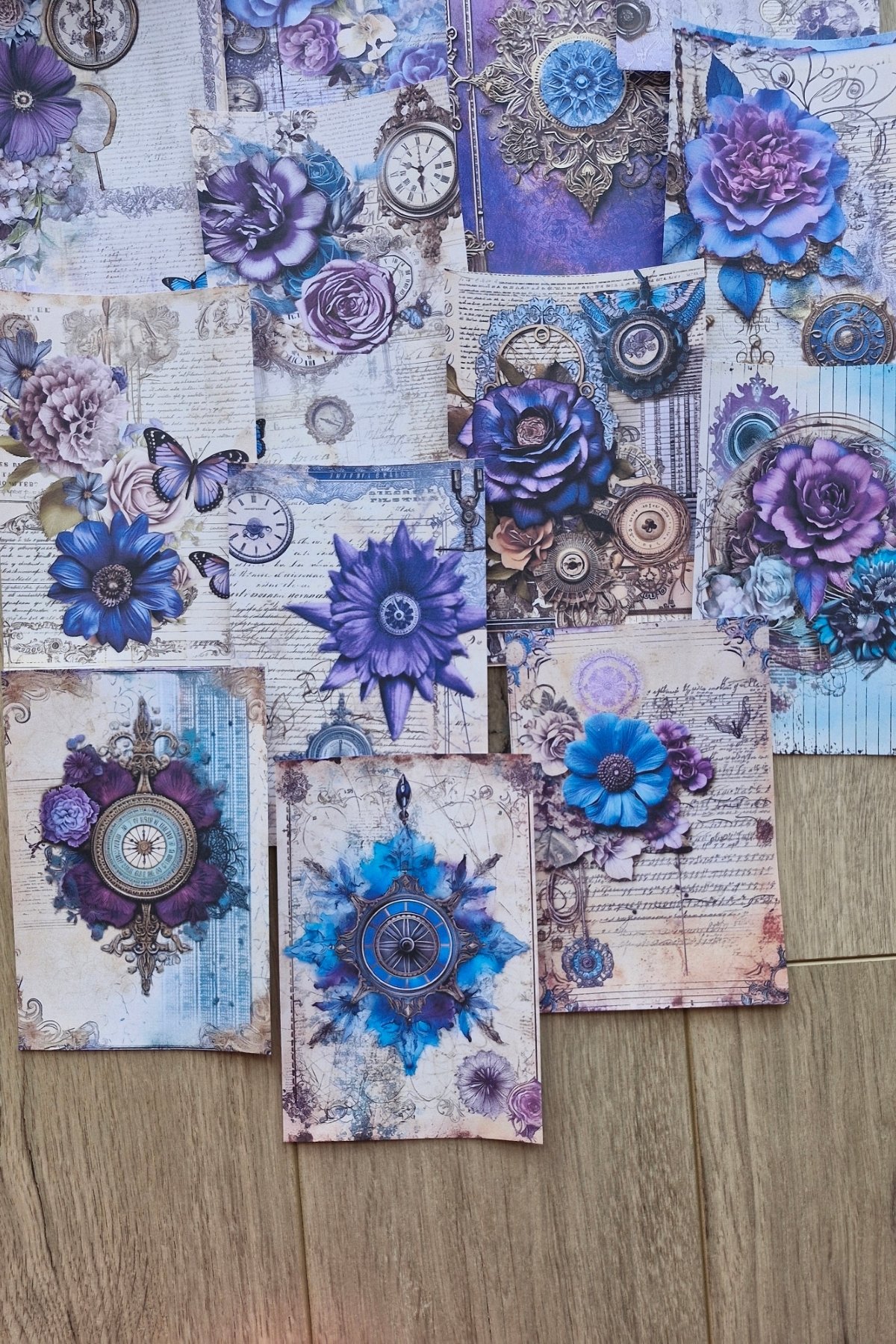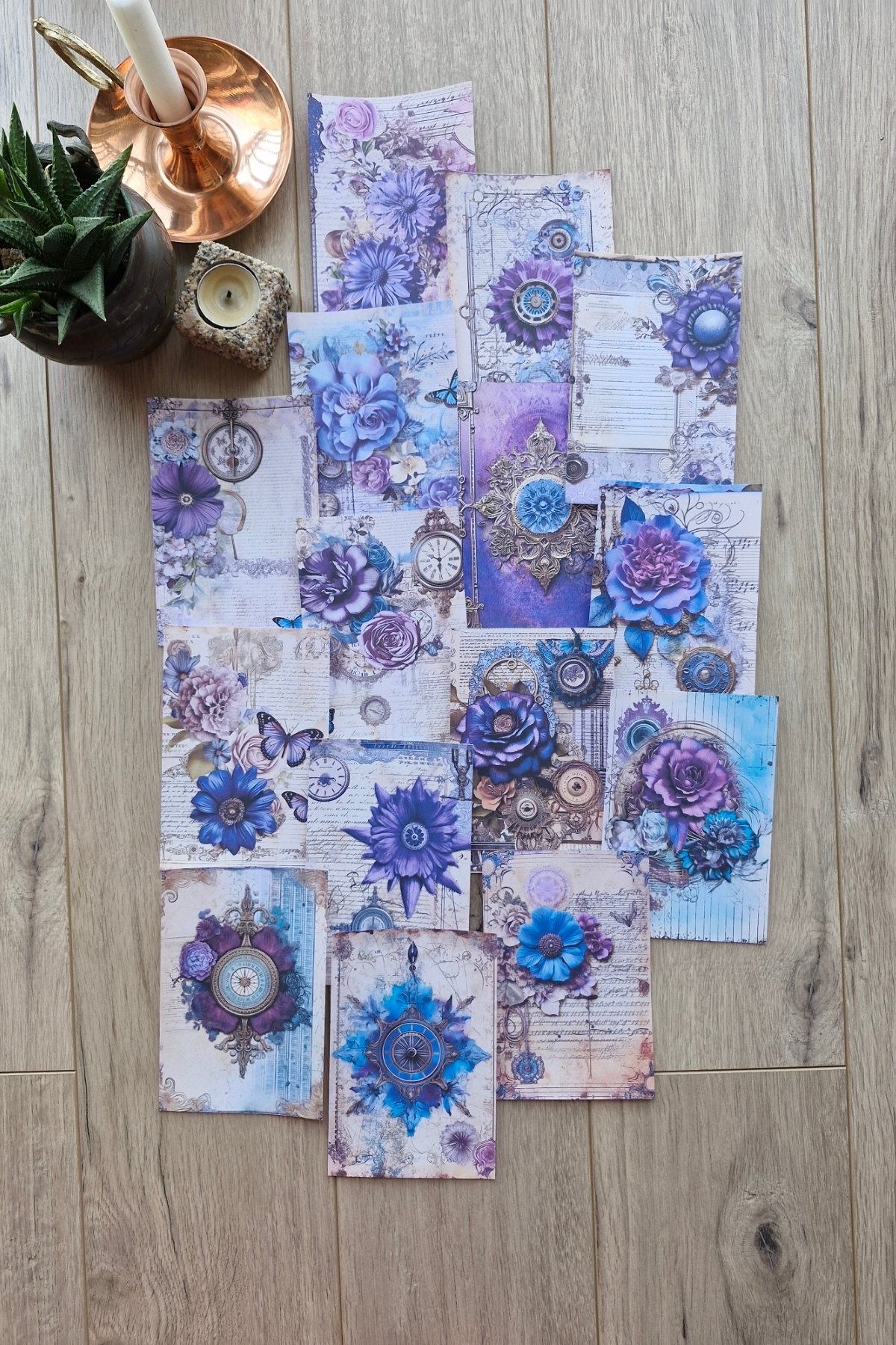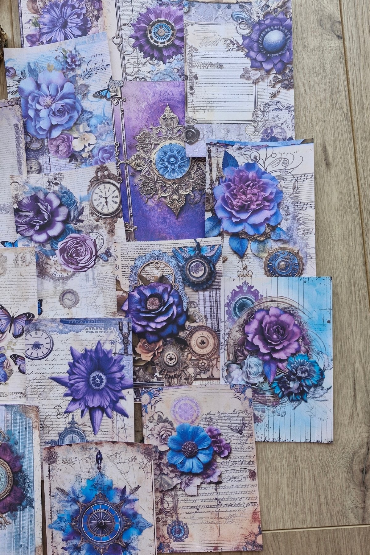 Vintage esintili tasarımıyla dikkat çeken 15 adet mor çiçek temalı scrapbook kağıdı, yaratıcılığınızı serbest bırakmanız için ideal bir zemin sunar