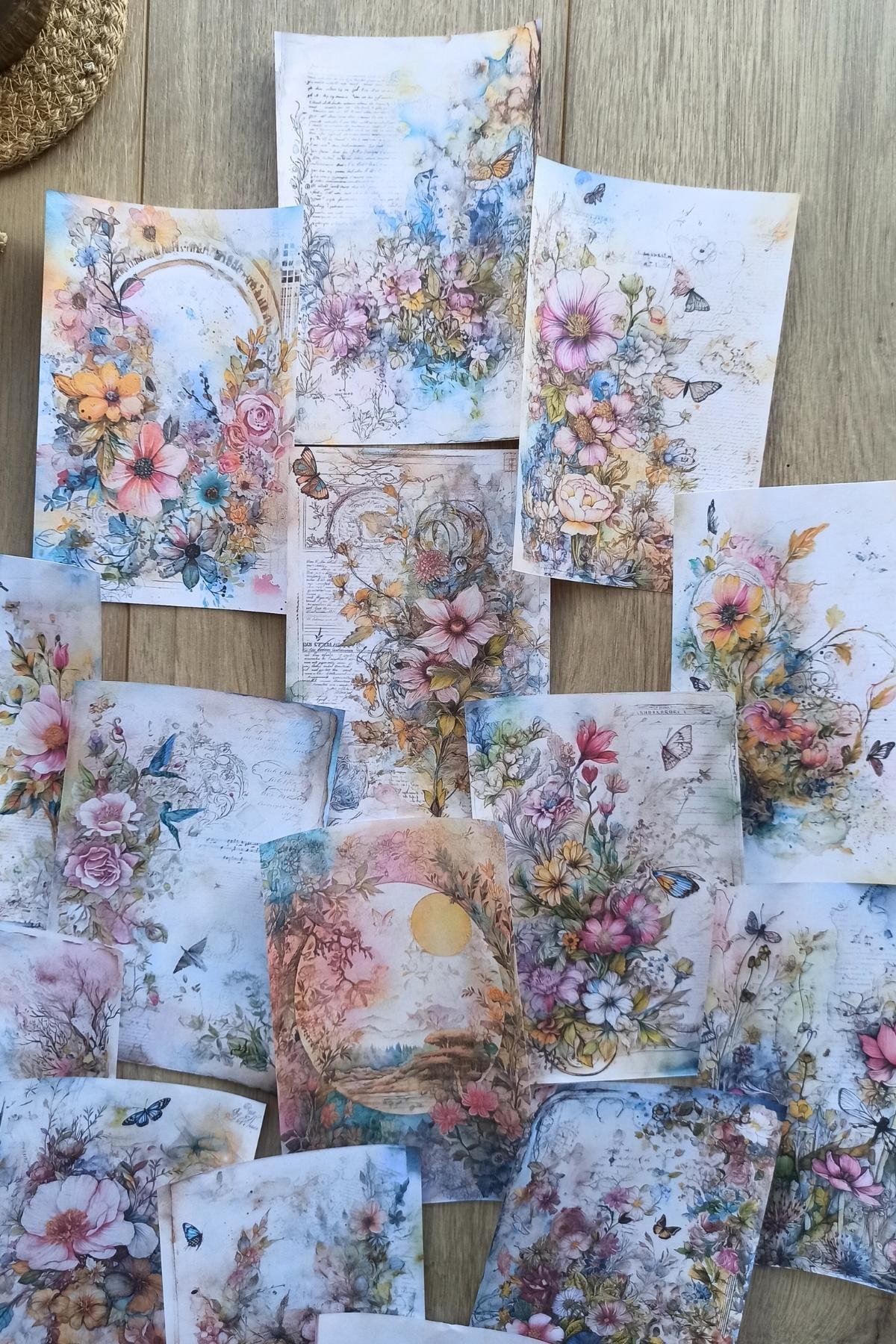 15 Adet Eskitme Vintage Suluboya Çiçek Temalı Scrapbook Kağıt Seti Bullet Journal Dekupaj Kağıdı