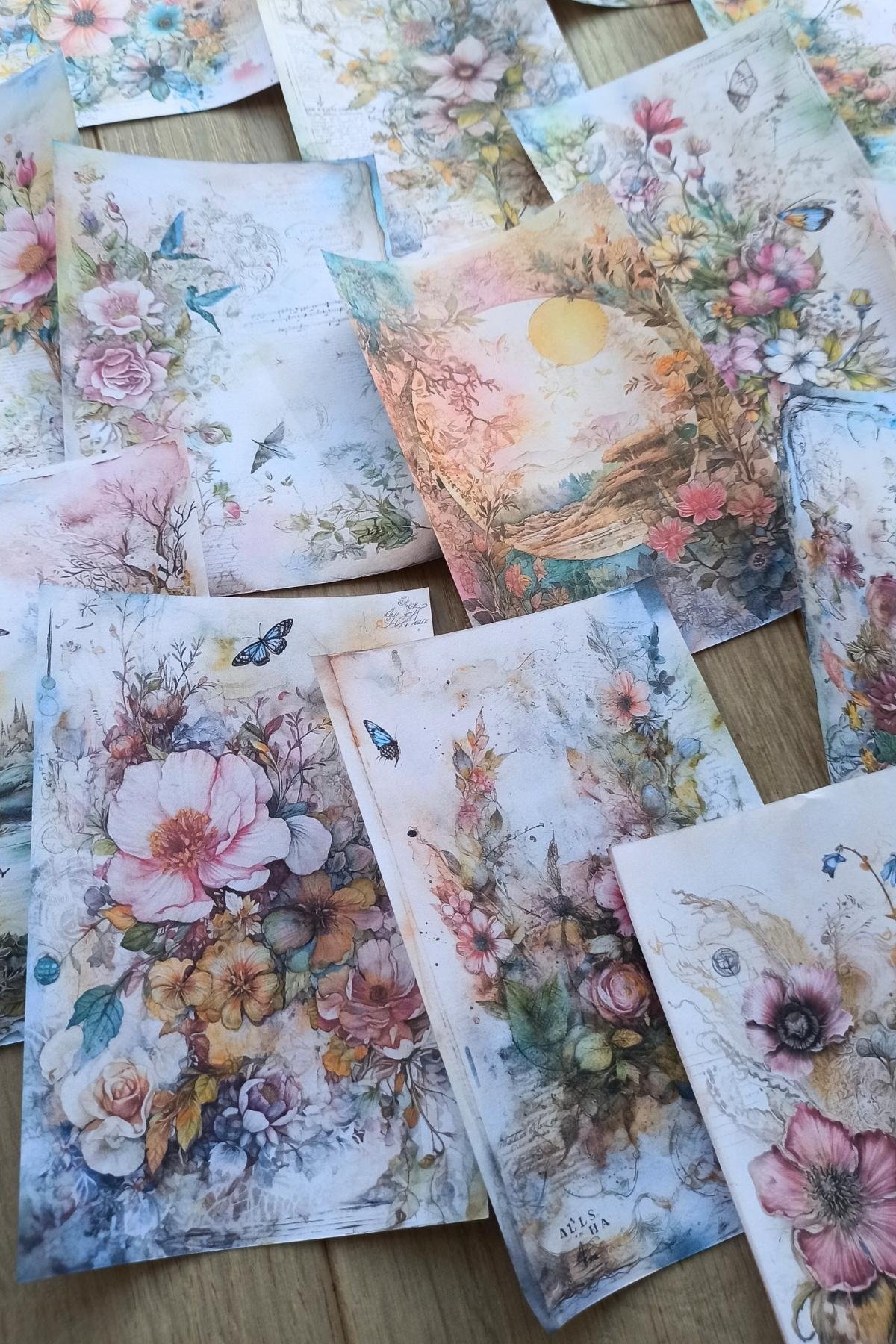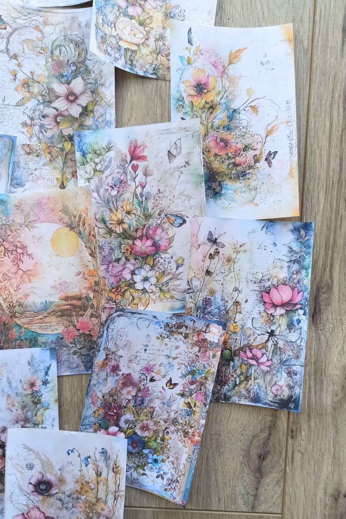 Eskitme vintage suluboya çiçek temalı scrapbook kağıdı, yaratıcılığınızı ifade etmeniz için ideal bir araçtır