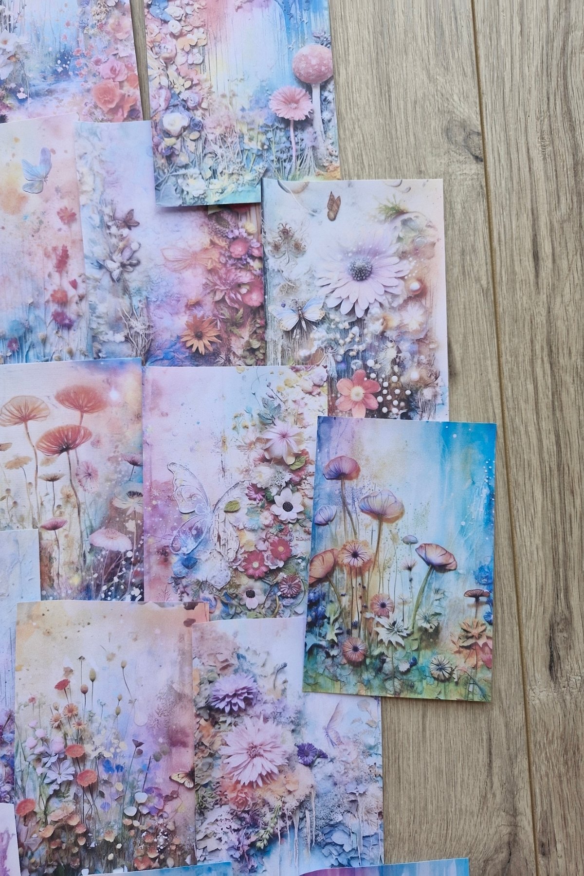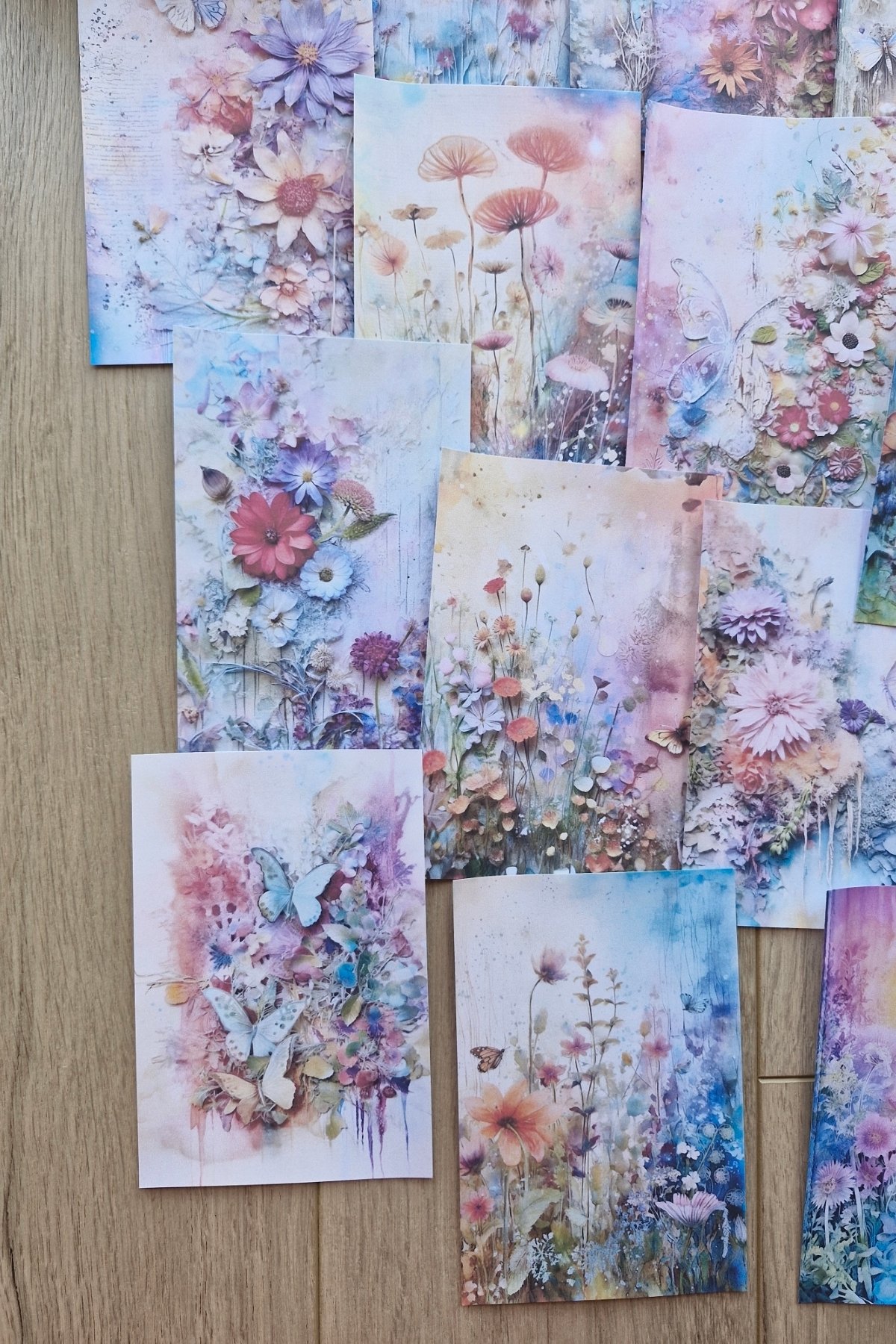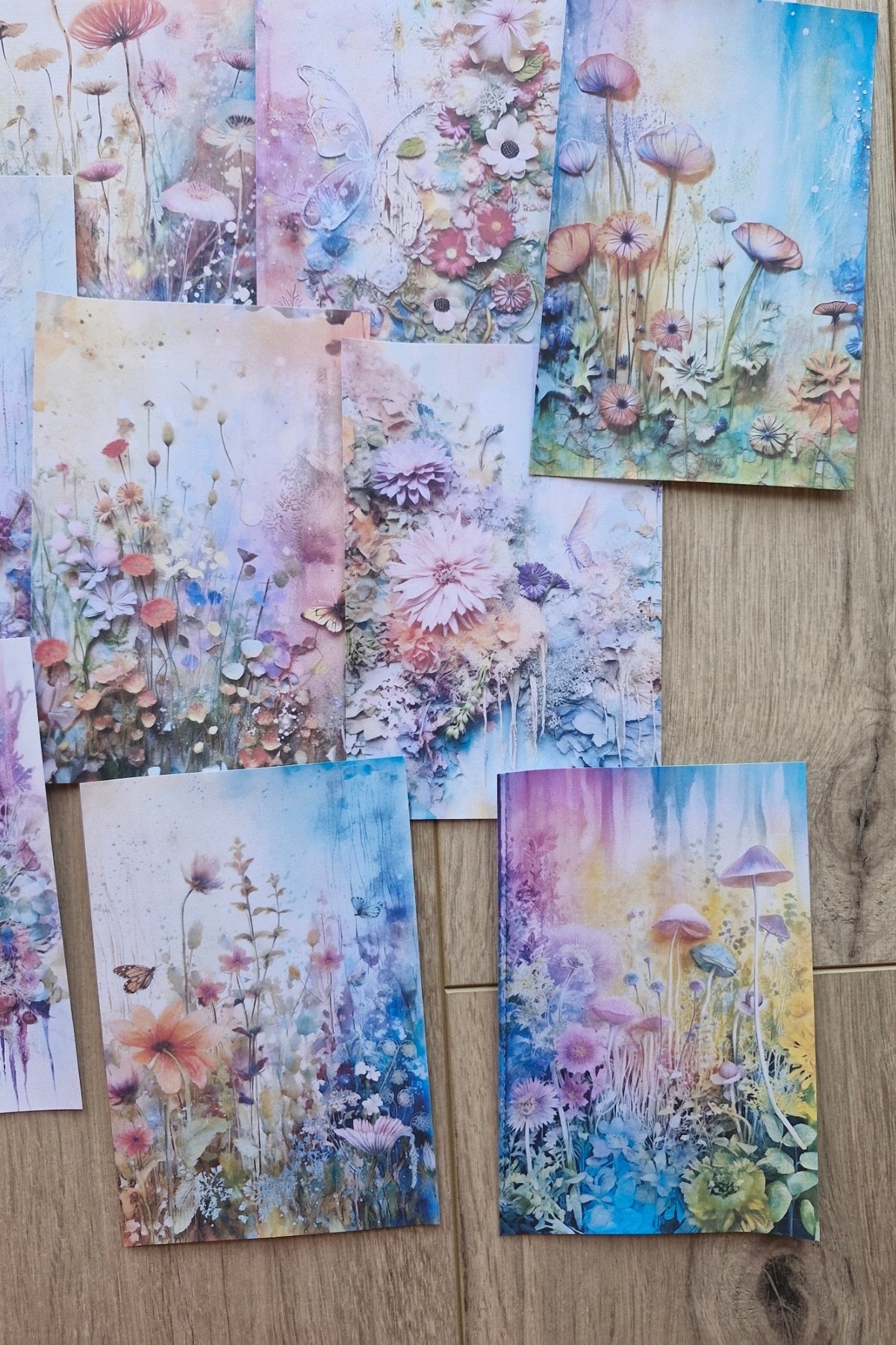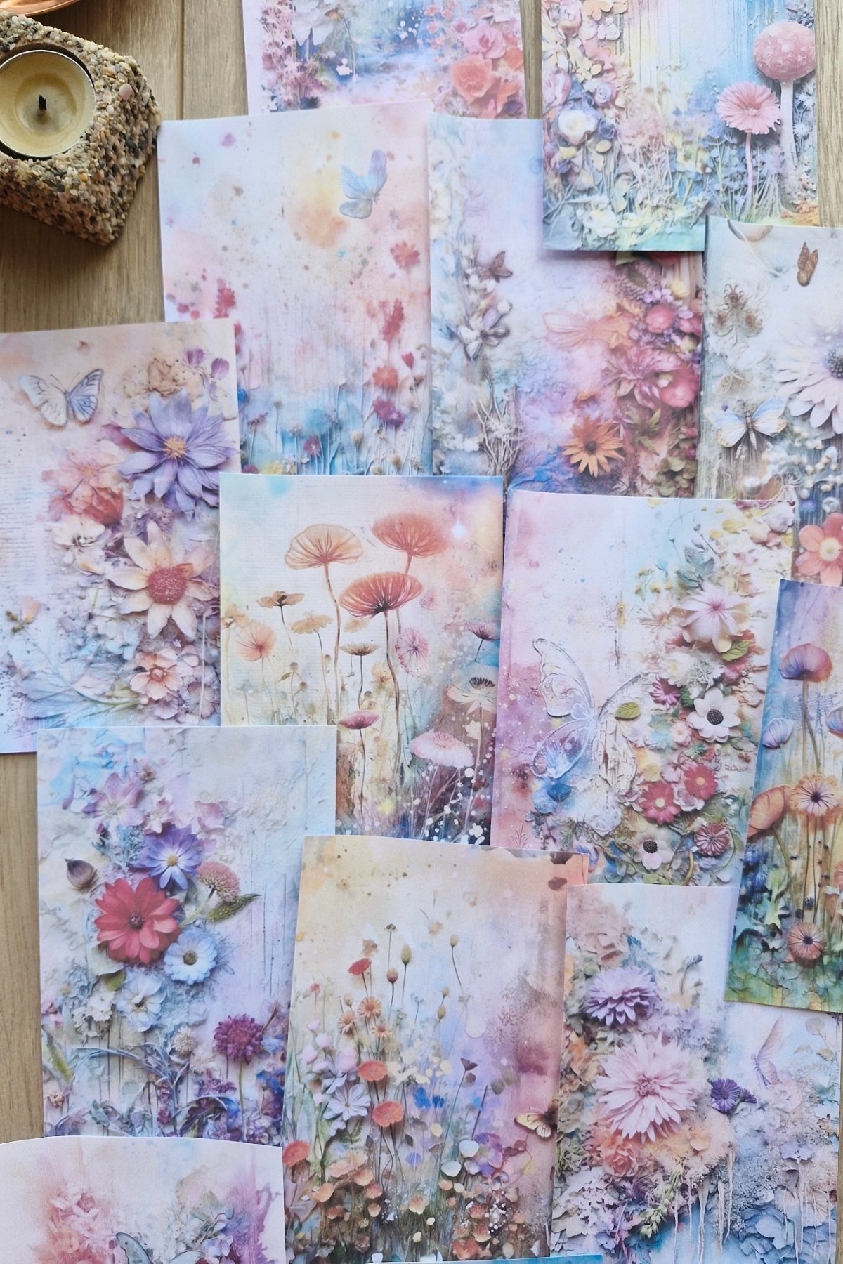 Eskitme vintage suluboya desenleriyle süslenmiş, orman temalı scrapbook kağıdı seti, yaratıcılığınızı ifade etmeniz için ideal bir zemin sunar