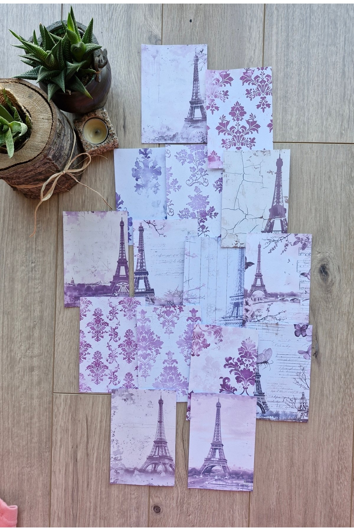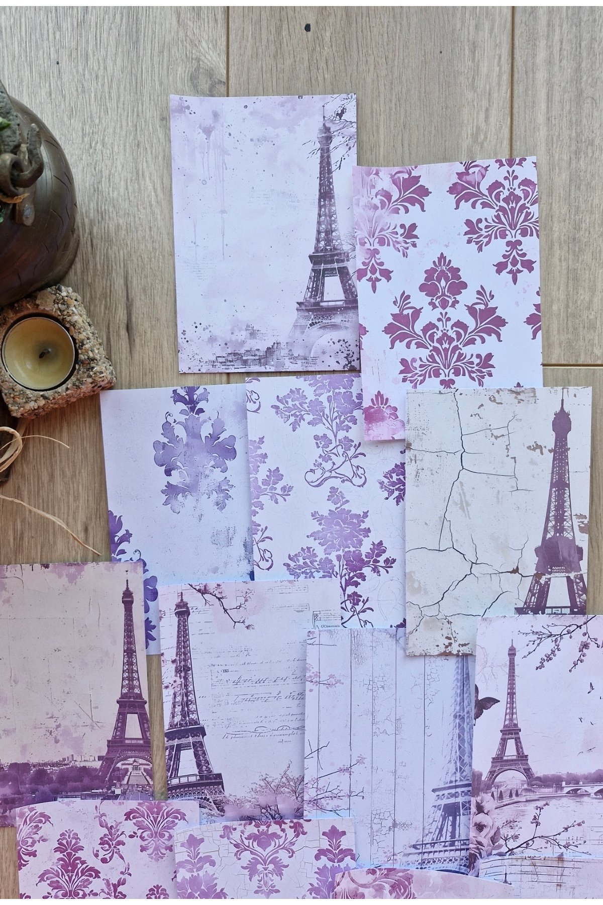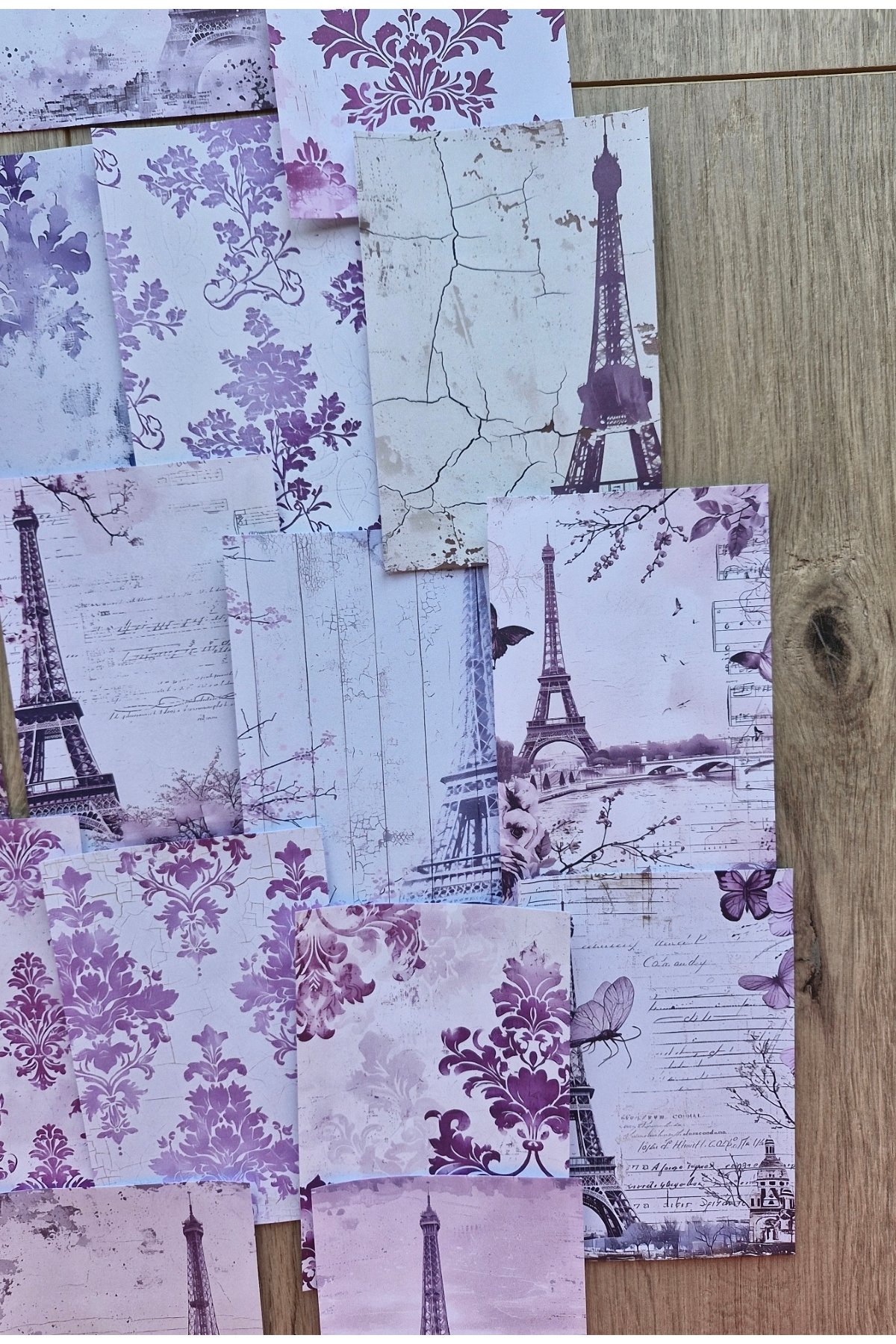 15 adet mor renkli scrapbook kağıdı seti, Eyfel Kulesi temalı dekorasyonuyla yaratıcılığınızı konuşturmanızı sağlar