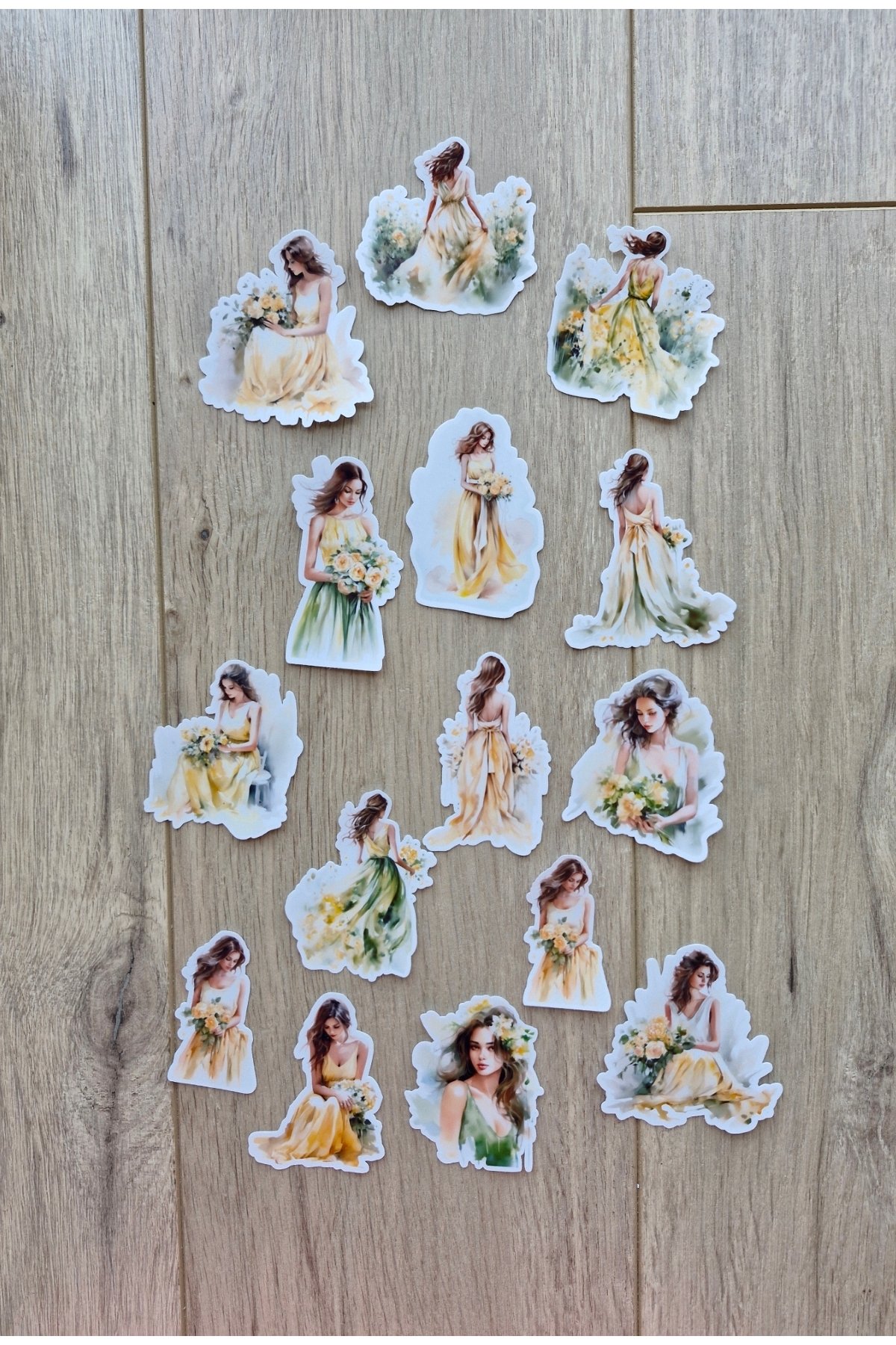 15 Adet Şeffaf Kız Sticker Seti Bullet Journal Scrapbook Laptop Sticker Yeşil Sarı Çiçek