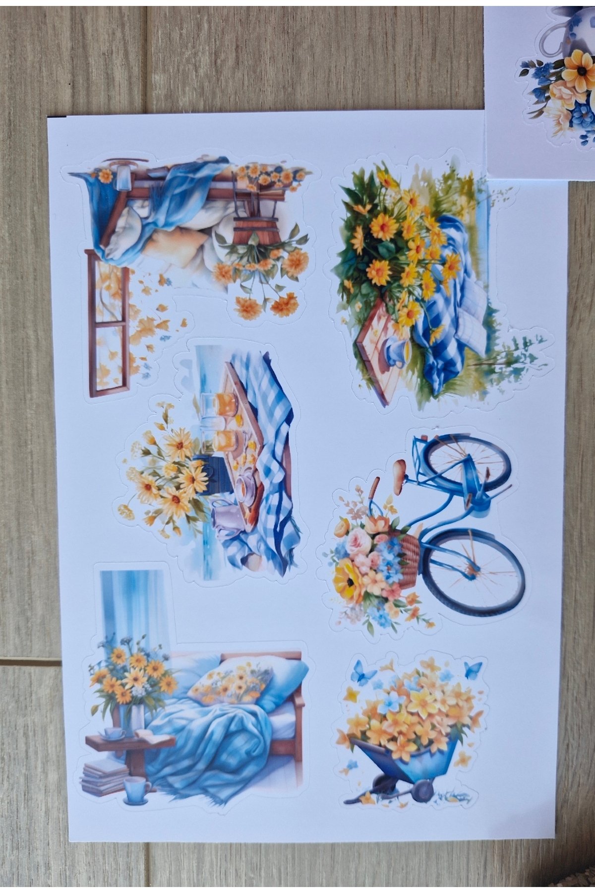 2 Sayfa 18 Adet Mavi Sarı Çiçek Temalı Sticker Seti Piknik Pencere Bisiklet Sticker Vintage Sticker