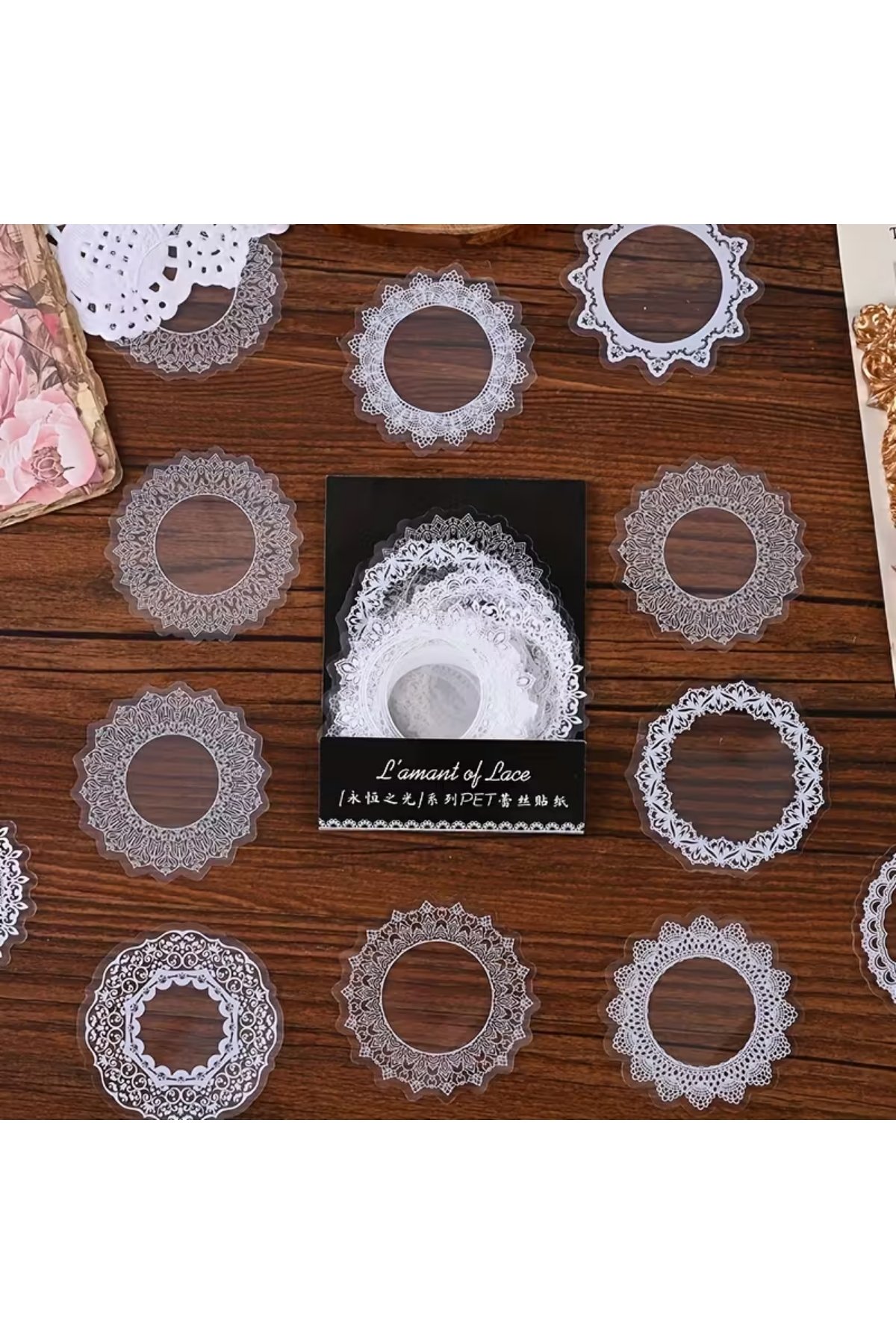 30 Adet Şeffaf Yuvarlak Beyaz Dantel Desen Sticker Bullet Journal Scrapbook Laptop Ajanda Planlayıcı