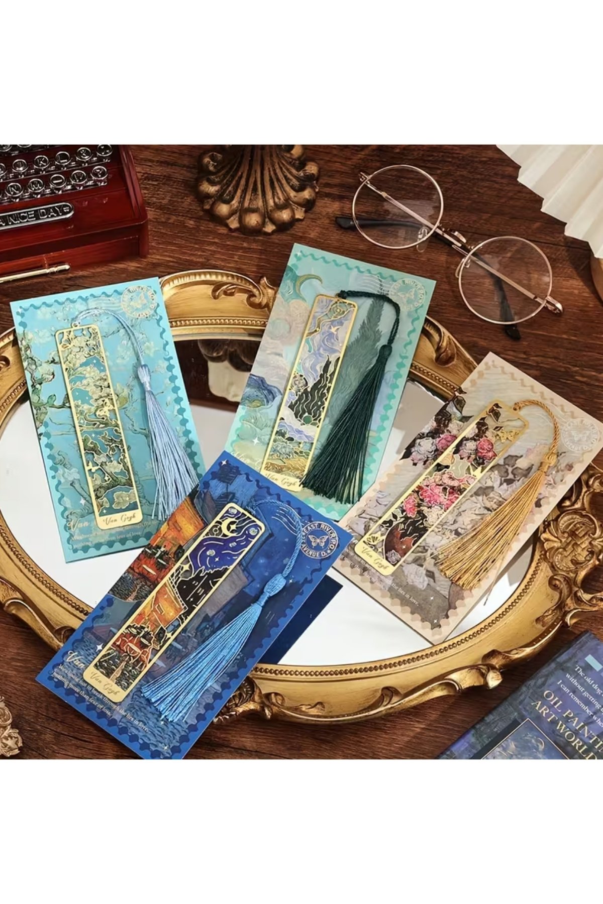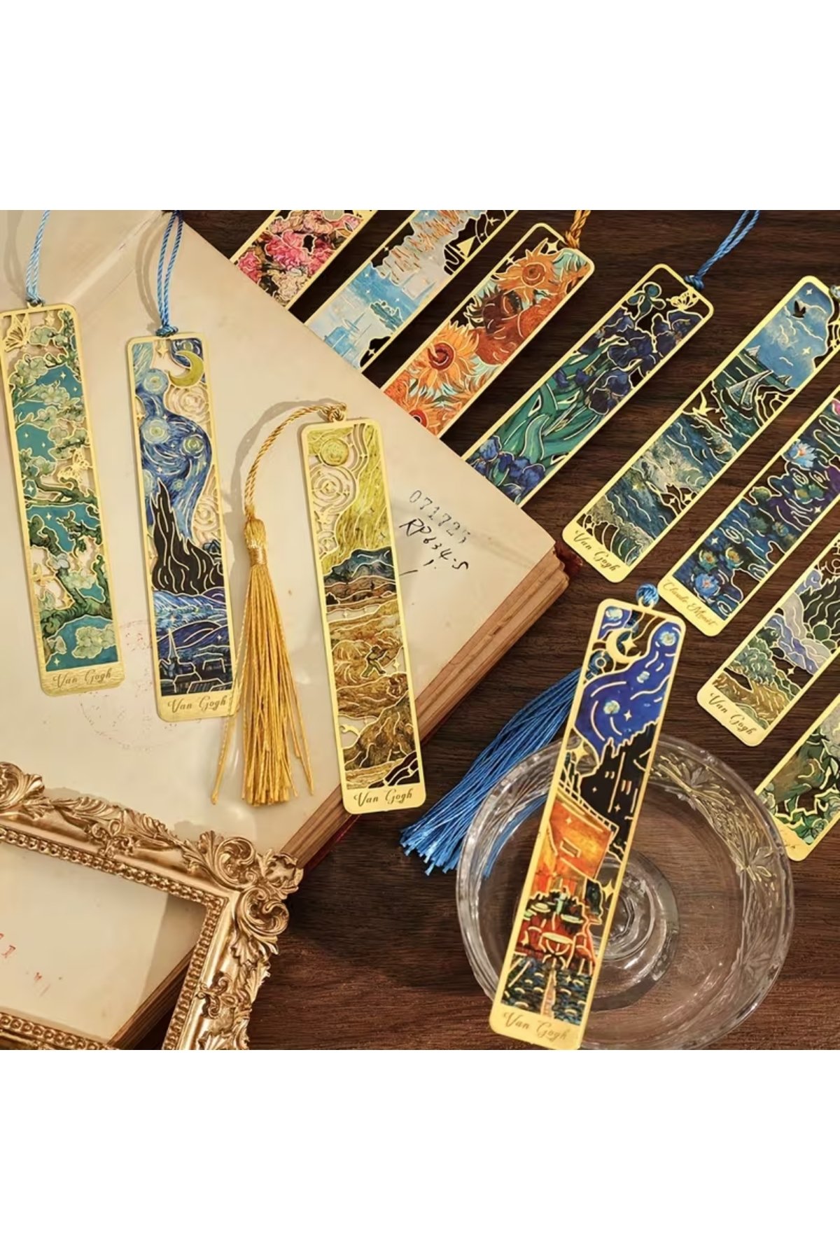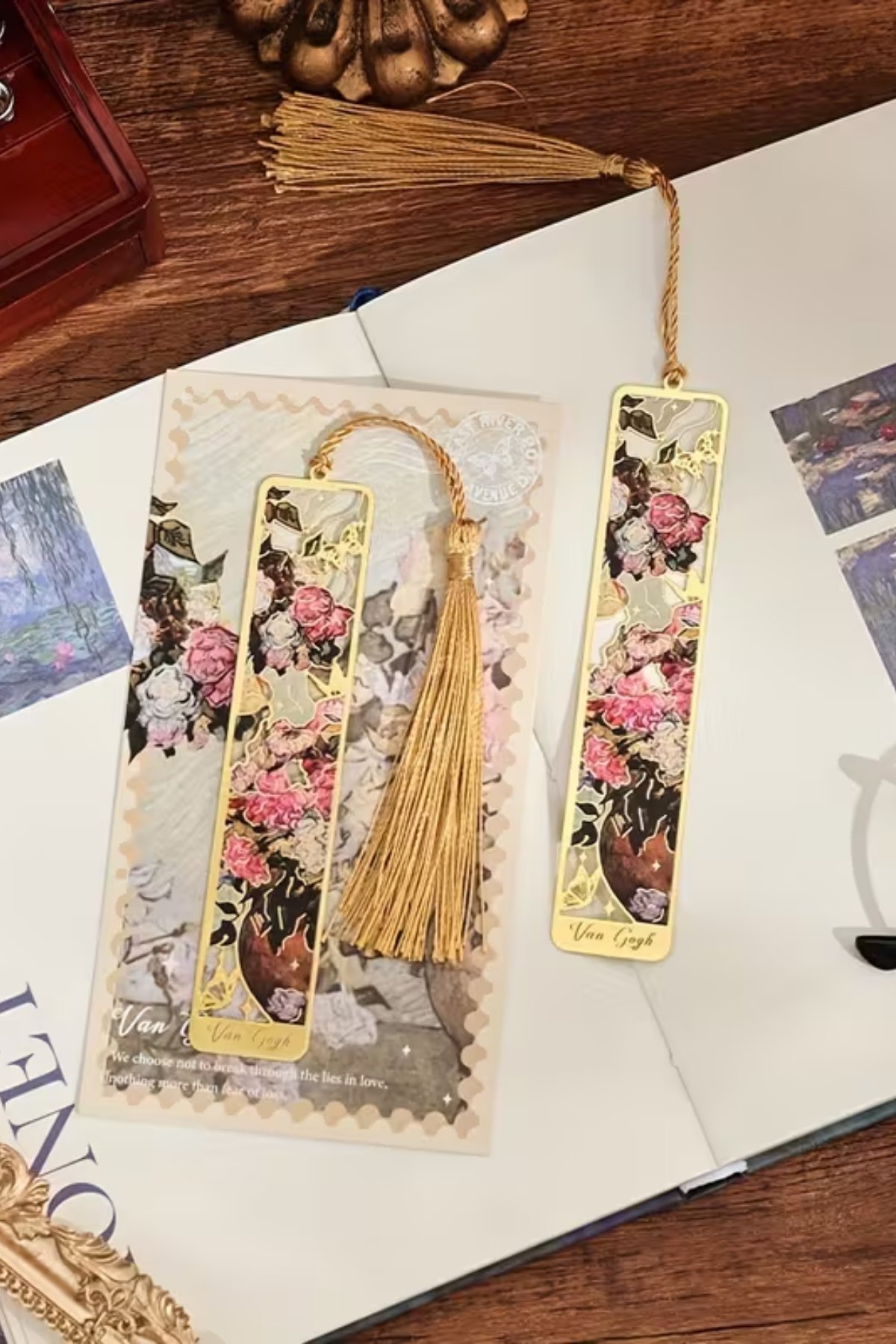 Pembe Güllü Vazo Van Gogh Püsküllü Altın Renk Metal Kitap Ayracı Hediyelik Sanatsal