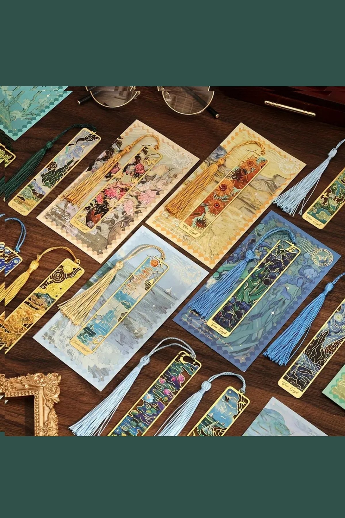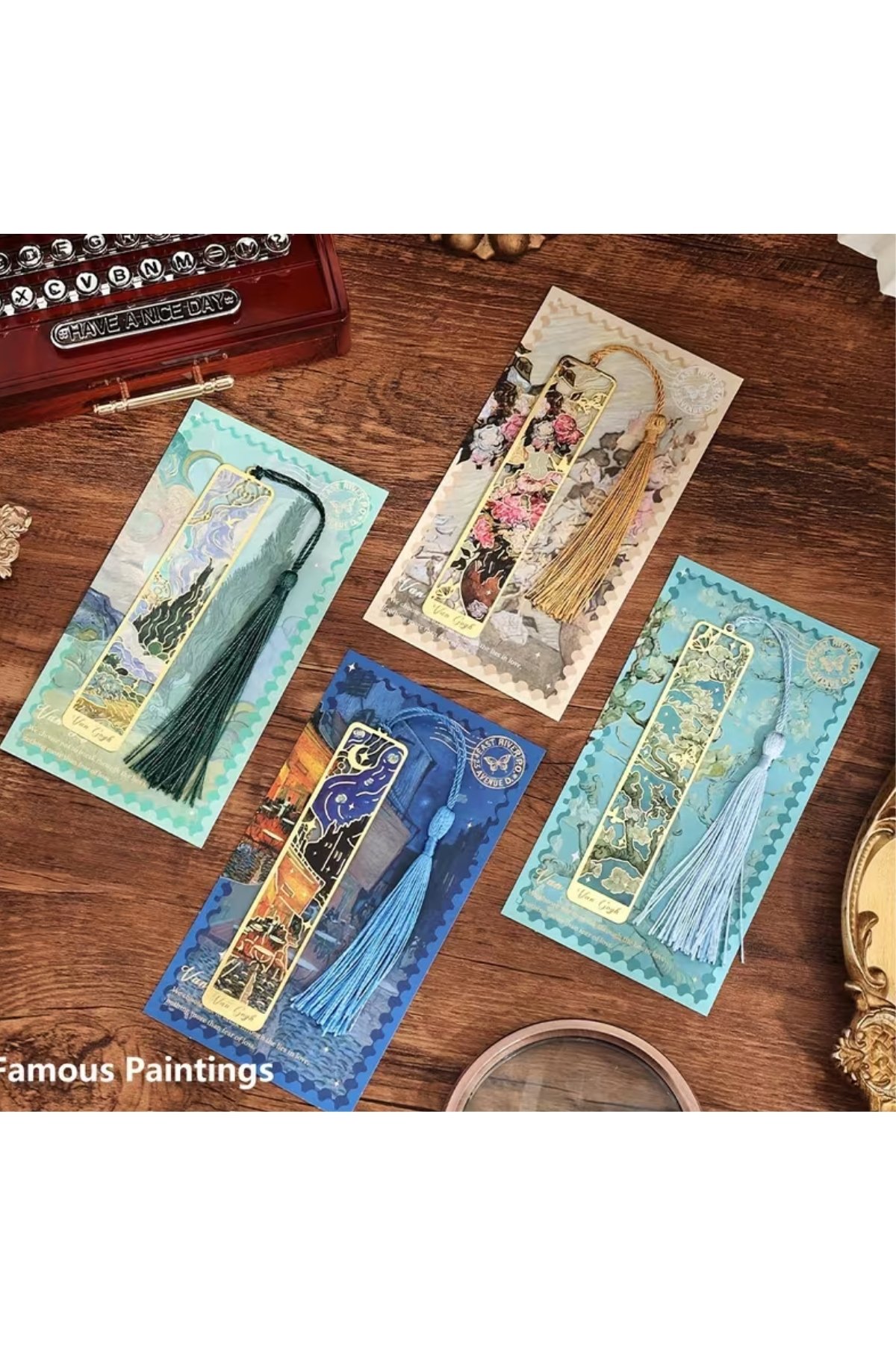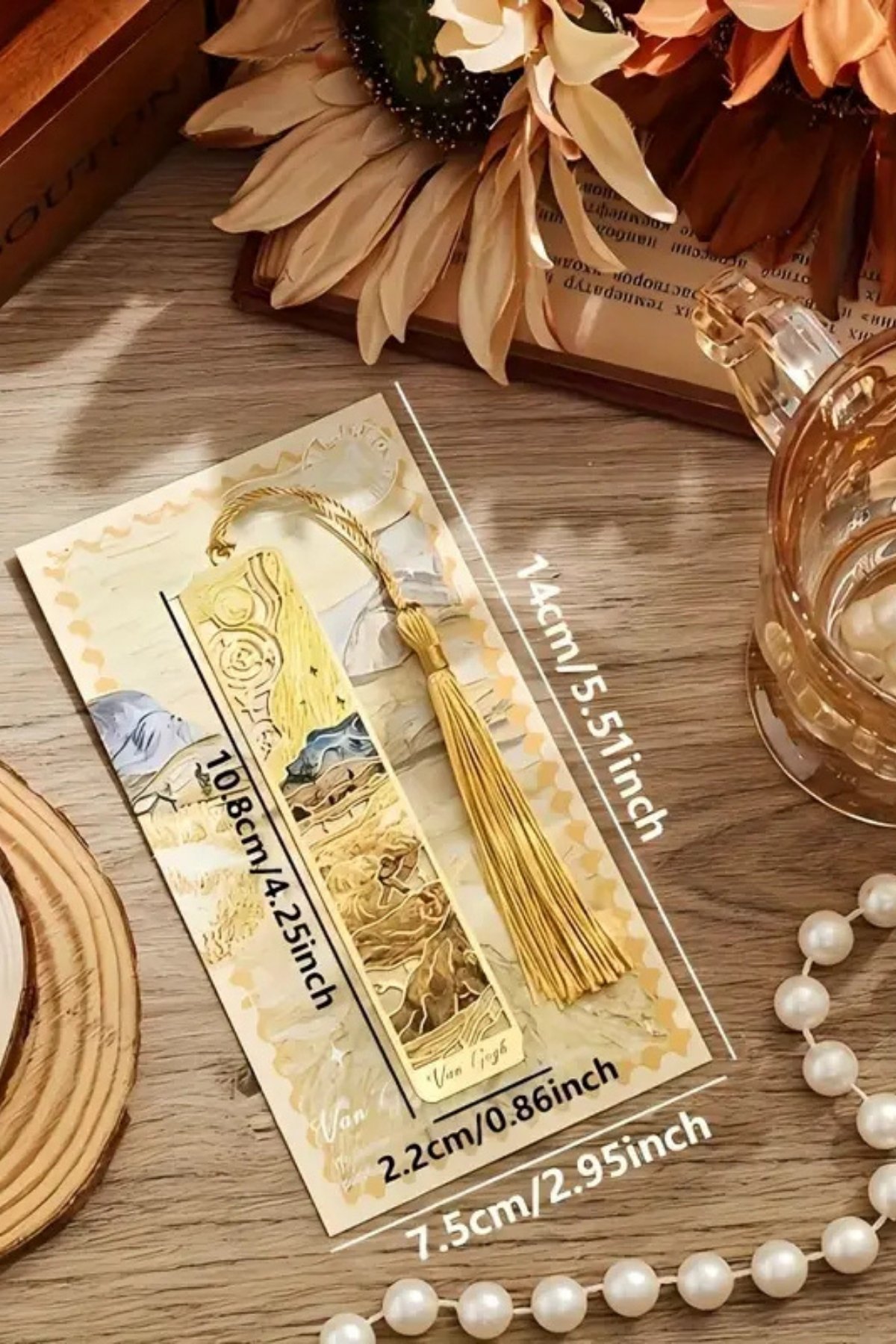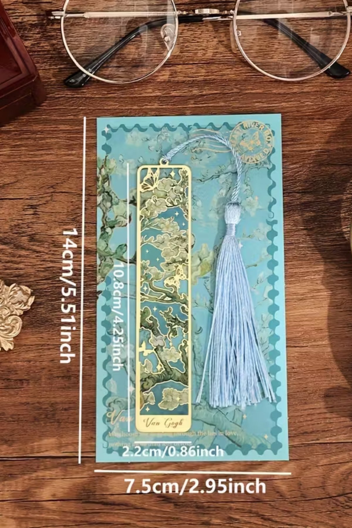 Pembe Güllü Vazo Van Gogh Püsküllü Altın Renk Metal Kitap Ayracı Hediyelik Sanatsal
